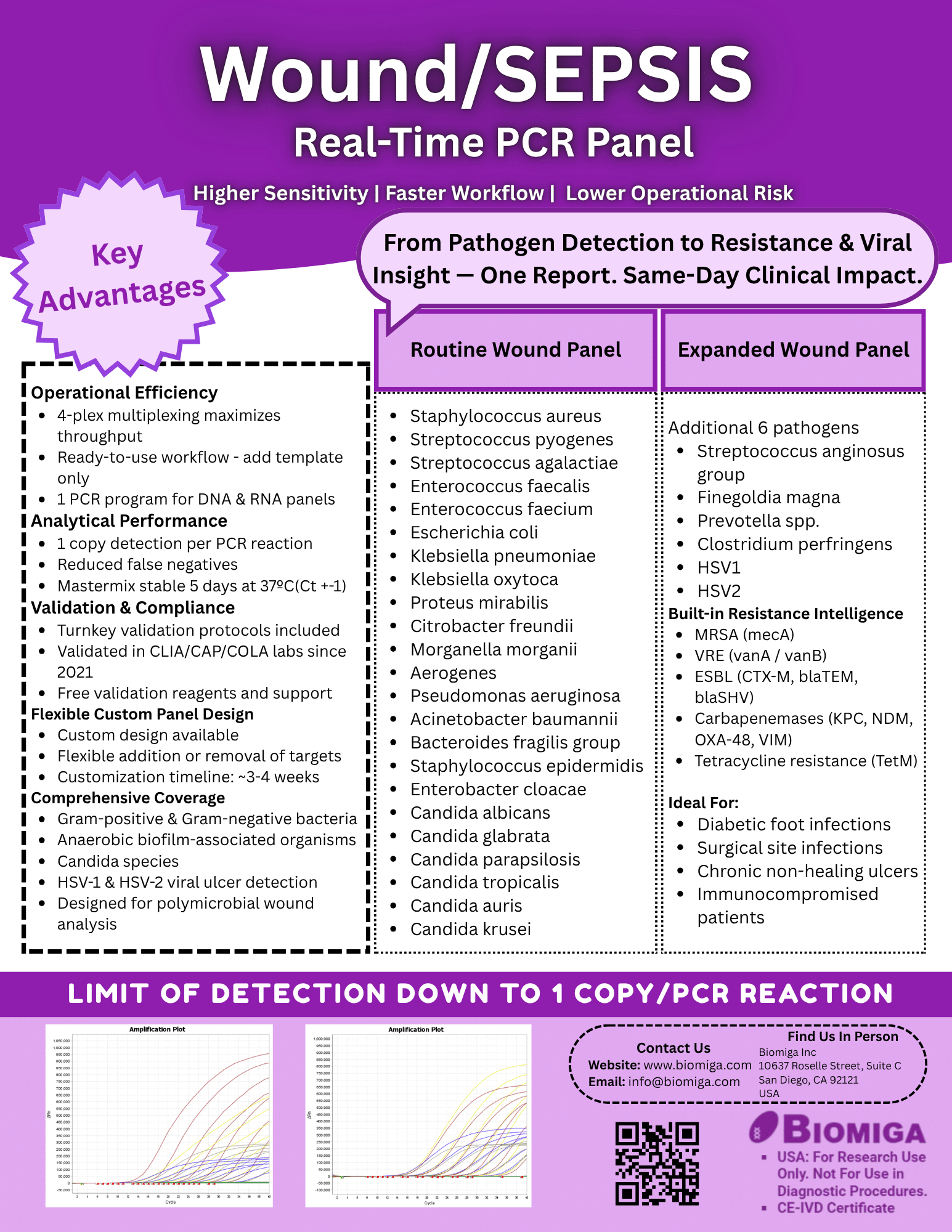 The Wound Panel Assay is a real-time PCR test intended for the qualitative detection of DNA from the wound swab. To collect the specimen, swab the wound by gently rotating a sterile calcium alginate or rayon swab between fingers. Swab the wound from margin to margin in a 10-point zigzag fashion. Use enough pressure to express fluid from within the wound tissue.